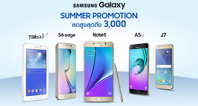 ซัมซุง ประเทศไทย จัดโปรโมชั่น Samsung Galaxy Summer Promotion ต้อนรับหน้าร้อนเอาใจลูกค้าทั้งหลาย ด้วยการนำสมาร์ทโฟนและแท็บเล็ตสุดฮิตมาลดราคาสูงสุดถึง 3,000 บาท โดยรุ่นที่ร่วมรายการมีดังนี้