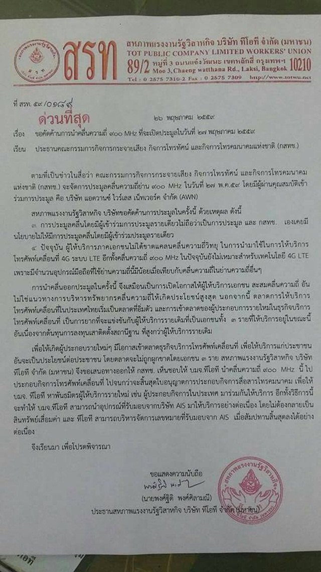 สหภาพแรงงานรัฐวิสาหกิจ บริษัท ทีโอที จำกัด (มหาชน) ได้ส่งหนังสือถึง พล.อ.ประยุทธ์ จันทร์โอชา นายกรับมนตรี และคณะกรรมการกิจการกระจายเสียง กิจการโทรทัศน์ และกิจการโทรคมนาคมแห่งชาติ (กสทช.) เพื่อขอคัดค้านการประมูล 4G คลื่นความถี่ย่าน 900 MHz รอบใหม่ ที่จะจัดขึ้นในวันที่ 27 พ.ค. 59 นี้