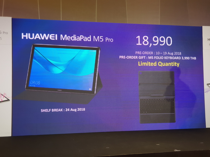 - HUAWEI MediaPad M5 Pro สี Space Gray จะวางจำหน่ายในราคา 18,990 บาท สามารถสั่งจองระหว่างวันที่ 10 - 19 สิงหาคมนี้ พิเศษ! รับของสมนาคุณ HUAWEI Folio Keyboard มูลค่ารวม 3,990 บาท ฟรี!