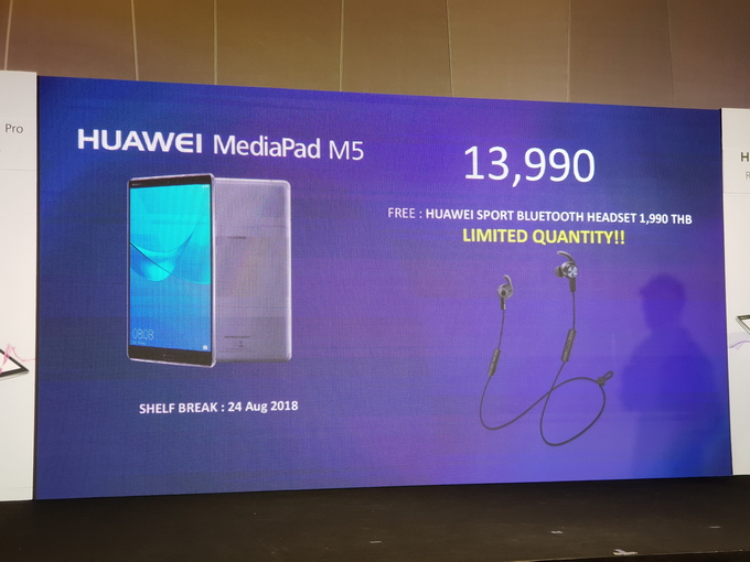 - HUAWEI MediaPad M5 สี Space Gray จะวางจำหน่ายในราคา 13,990 บาท แถมฟรีหูฟัง Bluetooth จำนวนจำกัด