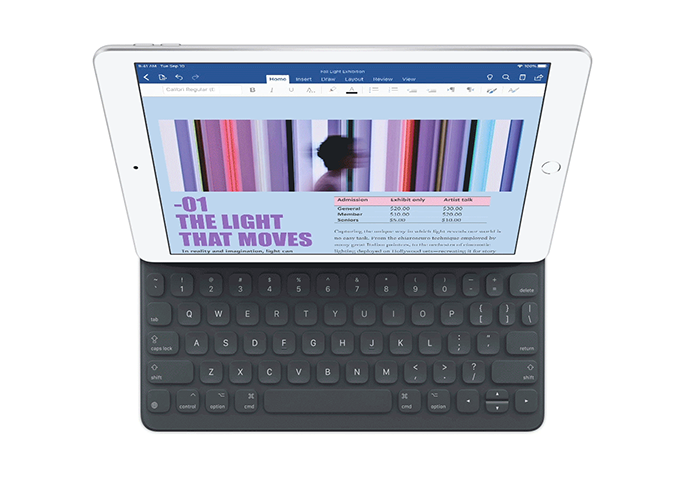- Smart Keyboard เป็นคีย์บอร์ดขนาดฟูลไซส์ที่เชื่อมต่อกับ iPad ขนาด 10.2 นิ้ว ด้วยตัวเชื่อมต่อ Smart Connector โดยมีวางจำหน่ายแยกต่างหากในราคา 5,900 บาท