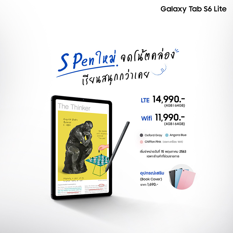 Galaxy Tab S6 Lite วางจำหน่ายอย่างเป็นทางการแล้ววันนี้ ในราคาเริ่มต้นเพียง 11,990 บาท สำหรับรุ่น Wi-Fi และ 14,990 บาท สำหรับรุ่น LTE นอกจากนี้ยังมีอุปกรณ์เสริมอย่างเคส Book Cover มาพร้อมที่เก็บ S Pen สามารถปรับมุมมองได้ 3 ระดับในราคา 1,690 บาท ที่ Samsung Experience Store และ Samsung.com ผู้ที่สนใจสามารถดูรายละเอียดเพิ่มเติมและสั่งซื้อได้ที่ www.samsung.com/th/tablets/galaxy-tab-s6-lite/buy