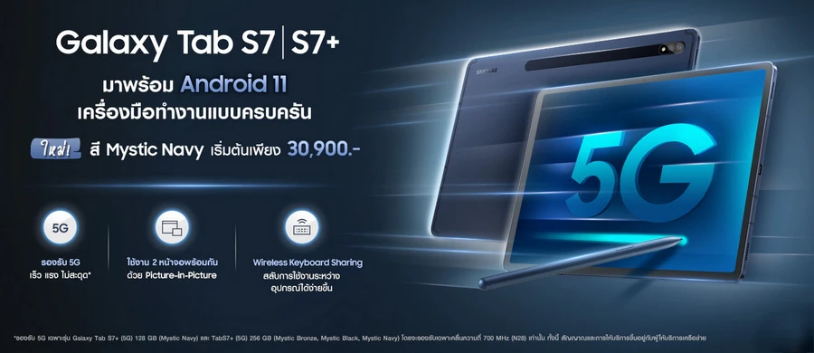 Samsung Galaxy Tab S7 และ Samsung Galaxy Tab S7+ รองรับ 5G สุดยอดแท็บเล็ตที่ตอบโจทย์ชีวิต Productive ปลุกพลังความคิดสร้างสรรค์ วางจำหน่ายสีใหม่ Mystic Navy ราคาเริ่มต้น 30,900 บาท (LTE) พร้อมอัพเดท Android 11 มาให้เรียบร้อยเลย สเปคแรงด้วย Qualcomm snapdragon 865+ พร้อมทั้งคีย์บอร์ด (จำหน่ายแยก) และ S Pen รุ่นใหม่ พร้อมมอบประสบการณ์การใช้งานเสมือนคอมพิวเตอร์พีซี ซึ่งทั้งหมดนี้จะช่วยให้ผู้ใช้สามารถทำงานได้มากขึ้นในเวลาที่น้อยลง ขณะเดียวกับแท็บเล็ตยังเป็นตัวช่วยด้านความบันเทิงของคุณไม่ว่าจะเป็นเกมที่ต้องสตรีมมิงกราฟฟิกความละเอียดสูง ก็สามารถทำได้ดีเยี่ยม ด้วยคุณภาพของหน้าจอที่มีอัตรารีเฟรชอยู่ที่ 120Hz หรือสามารถทำหลายๆ อย่างพร้อมกันในเวลาเดียวกัน สำหรับผู้ที่ต้องการพื้นที่การทำงานหรืออยากเต็มอิ่มกับความบันเทิงมากขึ้น