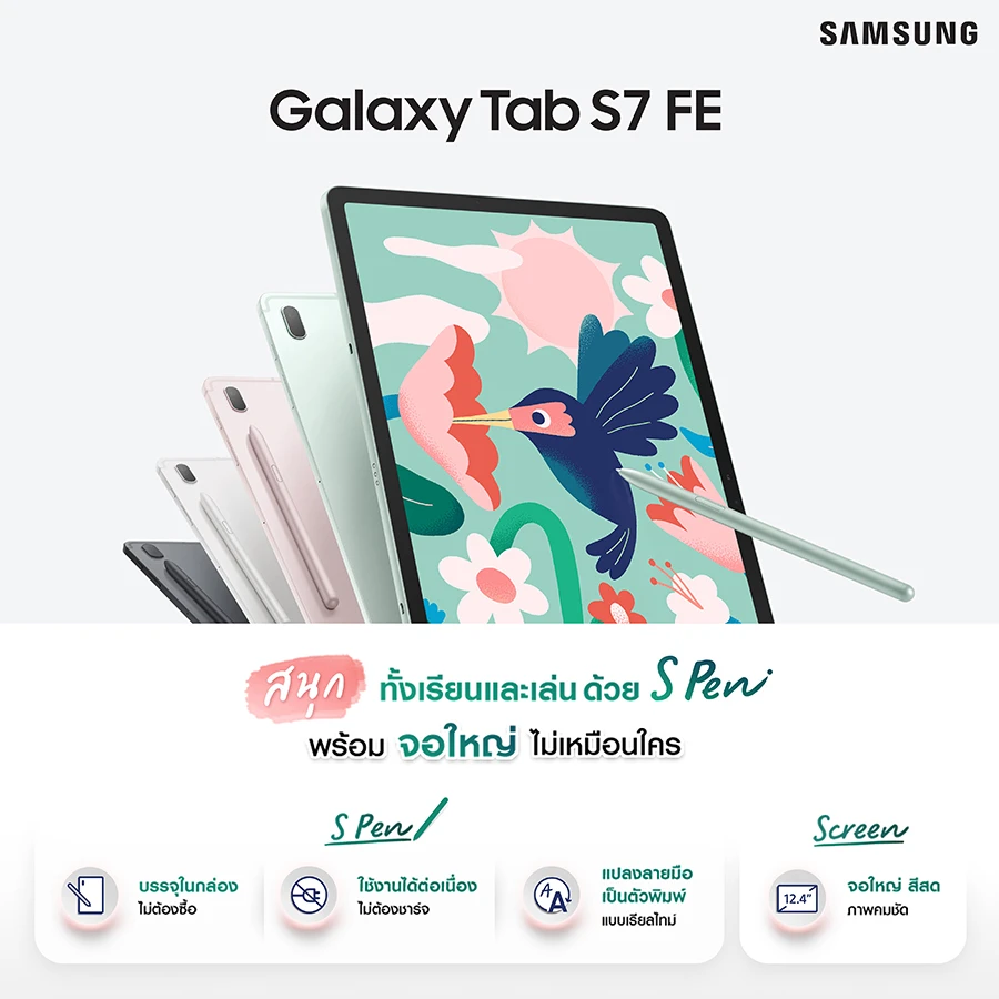 Samsung แนะนำ Galaxy Tab S7 FE แท็บเล็ตรุ่นใหม่ ที่รวมฟีเจอร์สุดโปรดของเหล่าแฟนๆ จากแท็บเล็ตรุ่นแฟลกชิปไว้ในเครื่องเดียว ไม่ว่าจะเป็นหน้าจอขนาดใหญ่ถึง 12.4 นิ้ว ปากกา S Pen ในกล่องไม่ต้องซื้อเพิ่มและไม่ต้องชาร์จแบตเตอรีให้เสียเวลา พร้อมฟีเจอร์ Multi-Active Window เพื่อการใช้งานหลายหน้าต่างพร้อมกัน และฟีเจอร์ Multi Instance เพื่อสร้าง Shortcut ให้สามารถทำงานพร้อมกันได้ถึงสามแอปพลิเคชันได้อย่างง่ายดาย มอบประสบการณ์ Multi-Tasking ทั้งเรียนและเล่นได้อย่างไหลลื่นไม่มีสะดุด