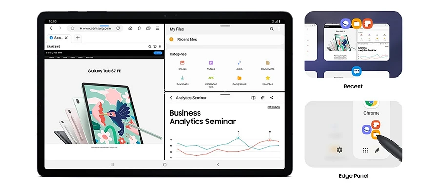พร้อมเข้าสู่ยุค Paperless อย่างเต็มรูปแบบ ไม่ต้องเปลืองเงิน เปลืองกระดาษในการพิมพ์ หรือหอบหิ้วเอกสารประกอบการเรียนให้เกะกะ ด้วยแอปพลิเคชัน Samsung Notes ที่สามารถเปิดไฟล์ PDF เพื่อจดโน้ตหรือเซ็นเอกสารได้ทันที หรือจะแปลงเป็นไฟล์ word ก็ยังทำได้ เท่านั้นยังไม่พอ! Galaxy Tab S7 FE ยังมีฟีเจอร์ Multi instance ที่สามารถแบ่งหน้าจอเพื่อใช้งานพร้อมกันได้สูงสุดถึง 3 แอปพลิเคชัน เช่น เปิดไฟล์ชีทเรียนผ่าน Samsung Notes เพื่อจดโน้ต หาข้อมูลเพิ่มเติมด้วย Google Chrome พร้อมฟังอาจารย์บรรยายจาก Microsoft Teams ไปด้วยก็ไม่ต้องสลับแอปพลิเคชันไปมาให้ชวนเวียนหัว ลืมการก้มๆ เงยๆ ระหว่างหน้าจอกับกระดาษไปได้เลย นอกจากนี้ ยังสามารถตั้งค่าเป็น App Pair เพื่อจับกลุ่มแอปพลิเคชันที่ใช้ร่วมกันบ่อยได้สูงสุด 3 แอปพลิเคชัน และเปิดใช้งานพร้อมกันได้ภายในคลิกเดียว