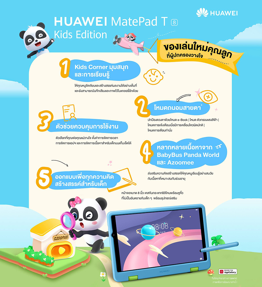 หัวเว่ย คอนซูมเมอร์ บิสสิเนส กรุ๊ป (ประเทศไทย) เตรียมตัวเปิดฉากเซอร์ไพรส์ครั้งใหญ่ในรอบปีจับกลุ่มตลาดเด็กและผู้ปกครองโดยเฉพาะ กับการเปิดตัวแท็บเล็ตสำหรับเด็ก HUAWEI MatePad T 8 Kids Edition ที่ตอบโจทย์การใช้งานของเด็กๆ ได้อย่างปลอดภัยสมวัยและเป็นประโยชน์ต่อการเรียนรู้และการเติบโตของเด็กแบบรอบด้าน เพราะมาพร้อมกับหลากหลายฟีเจอร์ที่เป็นประโยชน์และมัลติมีเดียแบบครบครันเพื่อสนับสนุนการเรียนแบบจัดเต็มและเพื่อการพักผ่อนที่แสนสนุก