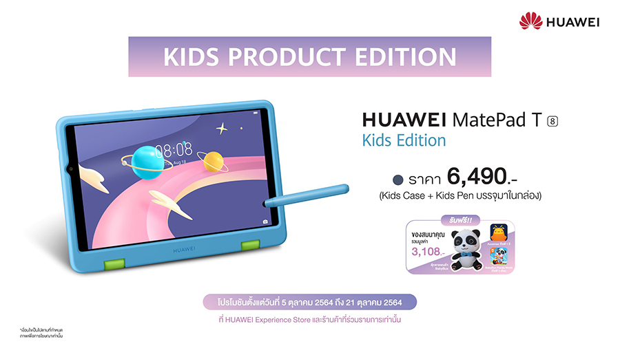 HUAWEI MatePad T 8 Kids Edition เปิดตัวในราคาเพียง 6,490 บาท พร้อมโปรโมชันสุดคุ้มสำหรับผู้ที่จับจองเป็นเจ้าของก่อนใคร รับทันทีของสมนาคุณมูลค่ารวม 3,108 บาท ประกอบด้วย ตุ๊กตา BabyBus Panda Doll มูลค่า 649 บาท ฟรีสิทธิ์สมาชิก Azoomee VIP ระยะเวลา 1 ปี มูลค่า 2,198 บาท และฟรีสิทธิ์สมาชิกเกม BabyBus Panda World ระยะเวลา 3 เดือน มูลค่า 261 บาท เมื่อซื้อสินค้าระหว่างวันที่ 5 - 21 ตุลาคม 2564 ทาง HUAWEI Experience Store, ร้านค้าตัวแทนจำหน่ายที่ร่วมรายการทั่วประเทศ รวมทั้งช่องทางออนไลน์ที่ HUAWEI Store และร้านค้าออนไลน์อย่างเป็นทางการของหัวเว่ยใน Shopee, Lazada และ JD Central