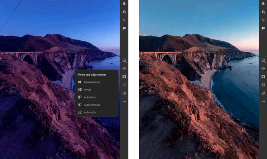 เพื่อแก้ไขปัญหาเรื่องโทนสี หรือสีที่ไม่สมดุลกัน และจากนั้นก็สามารถดำเนินขั้นตอนอื่นๆ เพิ่มเติมเพื่อปรับเปลี่ยนภาพถ่ายตามที่ต้องการ วิธีใช้งานก็คือ แตะที่คำสั่งอัตโนมัติจากไอคอน “Filters and adjustments” ซึ่งอยู่ทางด้านขวา จากนั้นก็เติม Content-Aware Fill จะสามารถแต่งภาพ และลบวัตถุที่ไม่ต้องการออกจากภาพ สะดวกและรวดเร็วภายในเวลาไม่กี่วินาที!