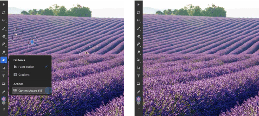 ทีมงาน Photoshop ใช้เวลากว่า 30 ปีในการพัฒนาเทคโนโลยีที่แปลกใหม่เพื่อยกระดับการแก้ไขภาพถ่าย และ Content-Aware Fill เป็นหนึ่งในฟีเจอร์สำคัญของ Photoshop Desktop และวันนี้เราได้นำเอาฟีเจอร์ดังกล่าวมาใส่ไว้ใน Photoshop on iPad ด้วยขั้นตอนการใช้งานที่ง่ายดาย แค่แตะหน้าจอเพียงครั้งเดียว ผู้ใช้สามารถเลือกพื้นที่และใช้ AI เพื่อเติมรายละเอียดได้เนียนไปกับสภาพแวดล้อมในรูปได้โดยผู้ใช้สามารถลบวัตถุที่ไม่ต้องการในแบ็กกราวนด์