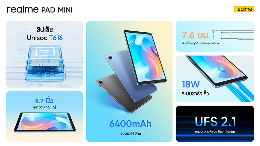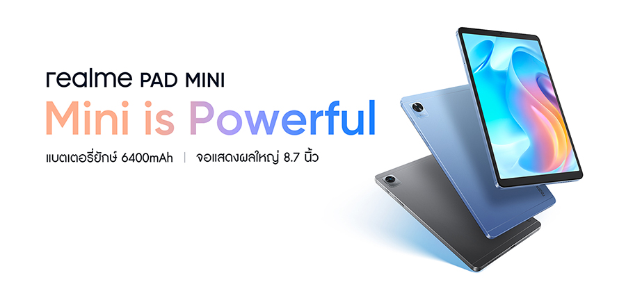 realme แบรนด์เทคโนโลยีเพื่อคนรุ่นใหม่ที่เติบโตเร็วที่สุดในโลก เปิดตัว "realme PAD mini" แท็บแล็ตน้องใหม่ ภายใต้คอนเซ็ปต์ Mini is Powerful ความมินิที่ทรงพลัง ไปได้กับทุกไลฟ์สไตล์ มาพร้อมจุดเด่นหน้าจอขนาด 8.7 นิ้ว ดีไซน์บาง 7.6 มม. หนักเบาเพียง 372 กรัม ชิปเซ็ต Unisoc T616 และแบตเตอรี่ 6,400 mAh ในราคาเปิดตัวเริ่มต้น 4,999 บาท