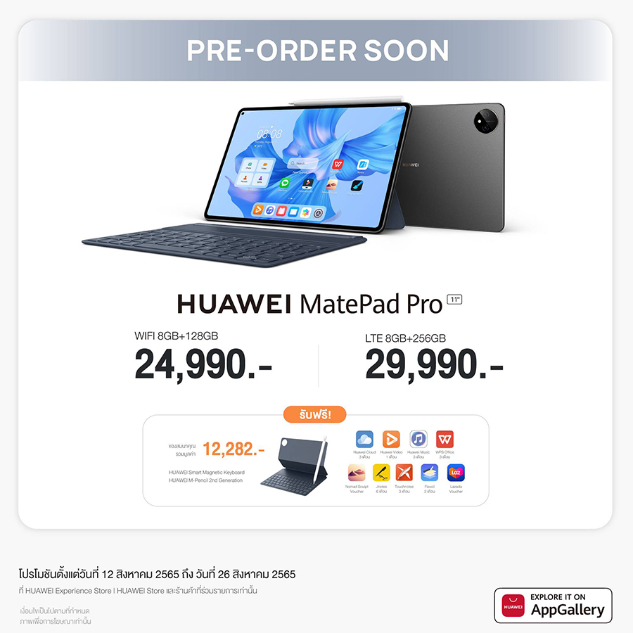 สำหรับ HUAWEI MatePad Pro 11-inch เตรียมวางจำหน่ายในประเทศไทย 2 รุ่นเร็วๆ นี้ ได้แก่ รุ่น WI-FI (8GB + 128GB) ราคา 24,990 บาท และรุ่น LTE (8GB + 256GB) ราคา 29,990 บาท พิเศษโปรโมชันพรีออเดอร์ระหว่างวันที่ 12 - 26 สิงหาคม 2565 รับฟรี! HUAWEI Smart Magnetic Keyboard, M-pencil 2nd Generation และของสมนาคุณอื่นๆ มูลค่ารวม 12,282 บาท พิเศษมากขึ้นเมื่อลงทะเบียนล่วงหน้าสำเร็จบนเว็บไซต์ HUAWEI Store ระหว่างวันที่ 27- 11 สิงหาคม 2565 รับฟรี! กล่องของขวัญ City Travel Gift Package 2 มูลค่า 1,690 บาท ลงทะเบียนล่วงหน้าได้ที่ HUAWEI Store