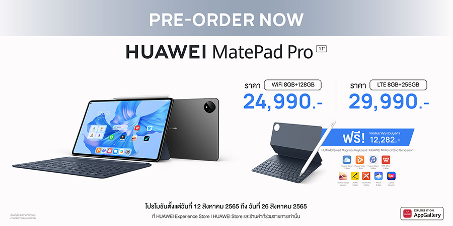ถึงเวลาพิสูจน์พลังแห่งจินตนาการไร้ขอบเขตและประสิทธิภาพการสร้างสรรค์ระดับโปรบน HUAWEI MatePad Pro 11-inch โดยมีวางจำหน่ายทั้งรุ่น WIFI (8GB + 128GB) ราคา 24,990 บาท และรุ่น LTE (8GB + 256GB) ราคา 29,990 บาท หากสั่งซื้อตั้งแต่วันที่ 12 - 26 สิงหาคม 2565 รับฟรี! HUAWEI Smart Magnetic Keyboard, HUAWEI M-pencil 2nd generation และสิทธิประโยชน์มากมายจาก HUAWEI AppGallery อาทิ บริการ HUAWEI Cloud ฟรี 3 เดือน บริการ HUAWEI Music ฟรี 3 เดือน บริการ HUAWEI Video ฟรี 1 เดือน และใช้งาน WPS Office ฟรี 3 เดือน เป็นต้น รวมมูลค่าของสมนาคุณ 12,282 บาท