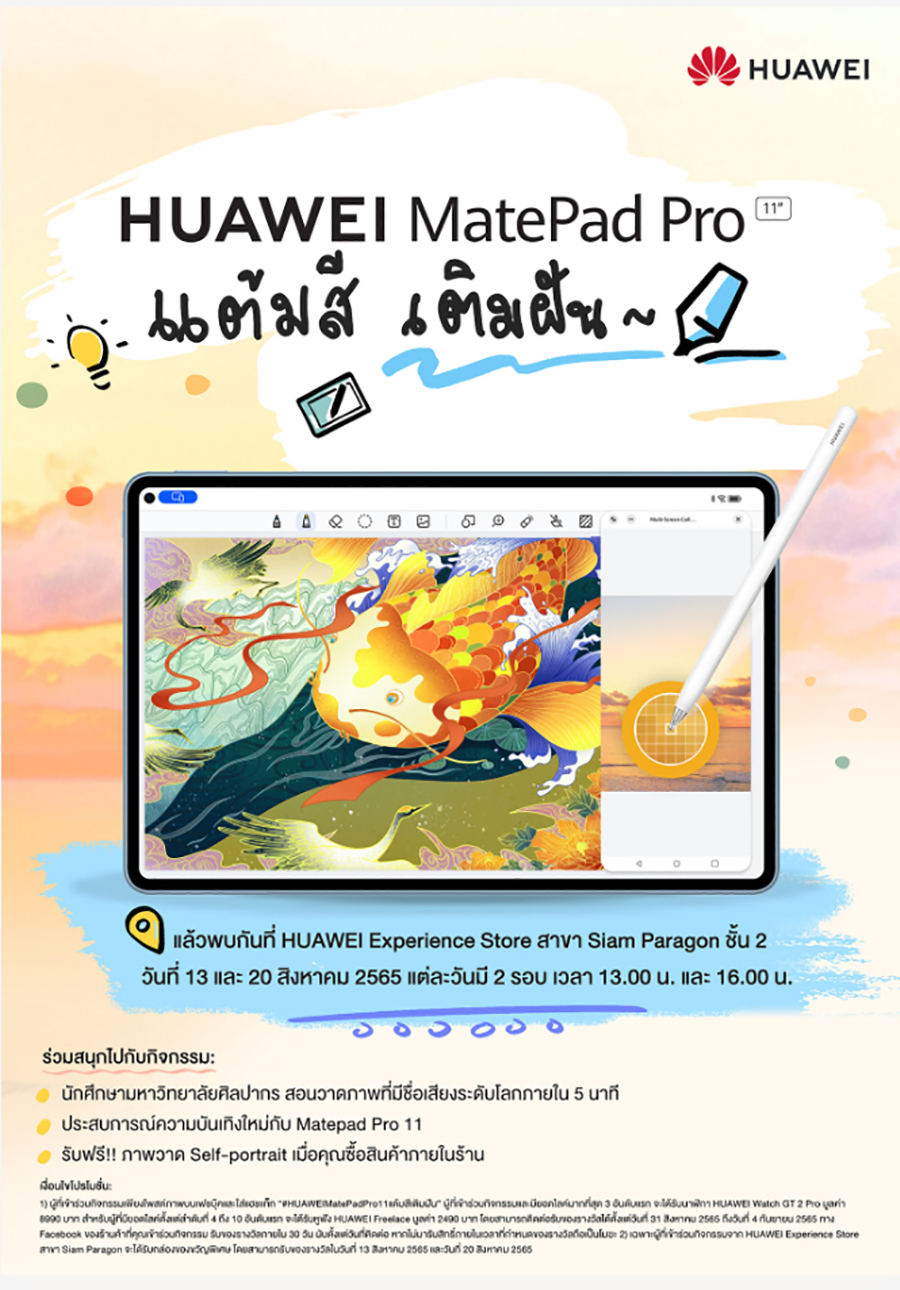 ในโอกาสเดียวกันนี้ หัวเว่ยยังจัดกิจกรรม Color Your Dream กับ HUAWEI MatePad Pro 11-inch ณ HUAWEI Experience Store สาขา สยามพารากอน ในวันเสาร์ที่ 13 สิงหาคม 2565 และวันเสาร์ที่ 20 สิงหาคม 2565 รอบเวลา 13.00 น. และ 16.00 น. เปิดโอกาสให้ลูกค้าที่สนใจได้สัมผัสประสบการณ์สุดล้ำกับการวาดรูปภาพที่มีชื่อเสียงโด่งดังระดับโลกด้วย HUAWEI MatePad Pro 11-inch ภายในเวลา 5 นาที โดยมีน้องๆ นักศึกษาจากมหาวิทยาลัยศิลปากรมาช่วยให้คำแนะนำอย่างใกล้ชิด จากนั้นลงทะเบียน HUAWEI ID และล็อกอินผ่าน HUAWEI Community หรือแอปพลิเคชัน My HUAWEI เพื่อเข้าร่วมกิจกรรม แล้วถ่ายรูปตัวเองคู่กับผลงานที่วาดบนแท็บเล็ต โพสต์ลงบนเฟซบุ๊กแล้วตั้งค่าเป็นสาธารณะพร้อมติดแฮชแท็ก #huaweimatepadpro11แต้มสีเติมฝัน โดยผลงานที่ได้ยอดไลก์สูงสุด 10 อันดับแรกภายในช่วงเวลาการจัดกิจกรรมจะได้รับ HUAWEI Watch GT2 Pro (สำหรับ 3 อันดับแรก คนละ 1 ชิ้น) และ HUAWEI Freelace (สำหรับอันดับที่ 4 – 10 คนละ 1 ชิ้น) รวมมูลค่าของรางวัล 44,400 บาท ประกาศผลทาง HUAWEI Community เวลา 18.00 น. ในวันที่ 29 สิงหาคม 2565 โดยหัวเว่ยยังเตรียมของขวัญสุดพิเศษมูลค่า 1,290 บาท มอบให้กับผู้ร่วมกิจกรรมทุกท่าน (ท่านละ 1 ชิ้น) นอกจากนั้น ลูกค้าที่ซื้อสินค้าภายในร้าน HUAWEI Experience Store สาขาสยามพารากอน ยังจะได้รับภาพบุคคลที่วาดโดยน้องๆ มหาวิทยาศิลปากรเป็นของที่ระลึกสุดเอ็กซ์คลูซีฟติดไม้ติดมือกลับบ้านไปอีกด้วย โดยเงื่อนไขเป็นไปตามที่บริษัทกำหนด และสามารถติดตามรายละเอียดกิจกรรมได้ที่ HES by Lake Com Siam Paragon
