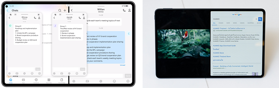 นอกจากการแบ่งหน้าจอซ้ายขวาแล้ว เรายังสามารถใช้พื้นที่หน้าจอ HUAWEI MatePad Pro 11-inch แบบเต็มที่ยิ่งกว่านั้นได้อีก ซึ่งไม่ใช่แค่การเปิด 2 หน้าจอบนแอปฯ เดียวกันแต่เป็นการเปิด 2 แอปฯ พร้อมกันเป็นหน้าจอซ้าย-ขวา ด้วยฟีเจอร์ Multi-windows ร่วมด้วยฟีเจอร์หน้าต่างลอย เพื่อเพิ่มความรวดเร็วในการทำงานหลายงานพร้อมกัน เช่น การทำเอกสาร อ่านโน้ตจากการประชุม เช็คอีเมล และหาข้อมูลผ่านเบราเซอร์ พร้อมกันในจอเดียวได้ถึง 4 หน้าต่าง ฟีเจอร์ที่ว่านี้ยังรองรับการเล่นวิดีโอในหน้าจอรูปแบบต่างๆ ทั้งแบบหน้าต่างคู่กับแอปฯ อื่น และการเล่นแบบ mini-player จอเล็กในกรณีที่ต้องใช้พื้นที่ในแอปฯ ทำงาน นั่นหมายความว่าการใช้ HUAWEI MatePad Pro 11-inch จะทำให้คุณทำงานโดยสามารถเปิดเพลงฟังไปด้วยได้ ทั้งโปรดักทีฟและรีแลกซ์ได้ในเวลาเดียวกัน