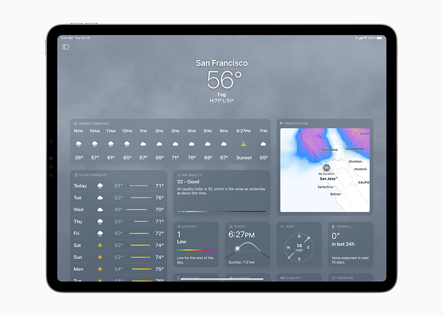 แอปสภาพอากาศมาอยู่บน iPad ในรูปแบบแอนิเมชั่นที่เต็มอิ่มสมจริง แผนที่แบบลงรายละเอียด และโมดูลการพยากรณ์อากาศต่างๆ ที่สามารถแตะเข้าไปดูได้ โดยออกแบบมาให้ใช้ประโยชน์จากจอภาพอันน่าทึ่งได้อย่างเต็มที่ ดังนั้นเพียงแค่แตะครั้งเดียวก็จะมองเห็นข้อมูลสภาพอากาศที่สำคัญที่สุด หรือจะสำรวจแผนที่เพื่อตรวจสอบปริมาณฝน คุณภาพอากาศ และอุณหภูมิก็ได้ ผู้ใช้ยังจะได้รับแจ้งหากมีการออกประกาศเตือนสภาพอากาศรุนแรงในพื้นที่ดังกล่าว หรือสามารถตรวจสอบคุณภาพอากาศได้ตามสเกลรหัสสี
