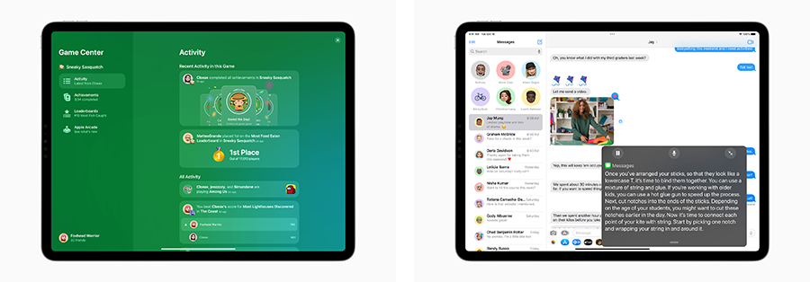- การป้อนตามคำบอกมอบประสบการณ์บนอุปกรณ์ในรูปแบบใหม่ โดยยินยอมให้ผู้ใช้สลับไปมาระหว่างเสียง การสัมผัส และการขีดเขียนข้อความด้วย Apple Pencil ได้อย่างสะดวก ผู้ใช้สามารถพิมพ์ด้วยคีย์บอร์ดหรือเขียนด้วยคุณสมบัติการขีดเขียนข้อความ แตะในช่องข้อความ เลื่อนเคอร์เซอร์ หรือแทรกคำแนะนำ QuickType ก็ทำได้ทั้งหมดโดยไม่ต้องหยุดการป้อนตามคำบอก อีกทั้งคุณสมบัติการป้อนตามคำบอกยังรองรับการใส่เครื่องหมายวรรคตอนแบบอัตโนมัติและสามารถใส่อิโมจิด้วยการป้อนตามคำบอกได้ด้วย