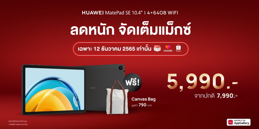 Lazada กดใส่ตะกร้ารอเลยโปรเด็ด 12.12 สำหรับลูกค้า 10 ออเดอร์แรกที่สั่งซื้อ HUAWEI MatePad SE 10.4” รับฟรีทันที HUAWEI FreeBuds 3 มูลค่า 3,999 บาท และสำหรับลูกค้าออเดอร์ที่ 11 - 100 รับฟรีทันที HUAWEI Antisudorific Band & Funny Pack Gift Package มูลค่า 1,690 บาท และสำหรับทุกคำสั่งซื้อจะได้รับ TrueID TV Box มูลค่า 2,490 บาท พร้อมกระเป๋า HUAWEI Canvas Bag มูลค่า 790 บาท นอกจากนี้ลูกค้ายังได้รับคูปองส่วนลดเพิ่มเติมอีกมากมาย