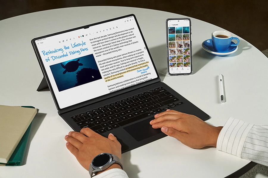 มากไปกว่านั้น Book Cover ซึ่งเป็นคีย์บอร์ดของ Galaxy Tab S9 และการทำงานของ DeX Mode ก็ได้มอบประสบการณ์ที่เปรียบเสมือนการใช้เดสก์ท็อปในรูปแบบของแท็บเล็ตน้ำหนักเบาพกพาง่ายและยังมาพร้อมกับประสิทธิภาพอันสูงสุดในขณะที่ทุกคนกำลังเดินทางท่องเที่ยวหรือต้องทำงานในระหว่างที่กำลังเดินทางนั้น อีกทั้งยังสามารถปรับเปลี่ยนคีย์บอร์ด Book Cover พร้อมทั้งแป้นพิมพ์ที่มีแสงออกมาให้ความรู้สึกเหมือนกำลังใช้งานบน PC และในขณะเดียวกัน DeX Mode ก็มาพร้อมกับเคอร์เซอร์ที่ช่วยให้ง่ายต่อการติดตาม และหน้าต่างที่สามารถปรับเปลี่ยนขนาดหรือการวางตำแหน่งได้ อีกทั้งยังรองรับ Second Screen หรือความสามารถในการเป็นหน้าจอที่สองในการสะท้อนหรือขยายหน้าจอของ PC ไปยังแท็บเล็ตได้ นอกจากนี้ผู้ใช้ยังสามารถทำงานร่วมกันได้สะดวกยิ่งขึ้นโดยการแชร์หน้าจอและทำการแก้ไขข้อมูลบน Samsung Note แบบเรียลไทม์ไปพร้อมกันได้ผ่าน Google Meet