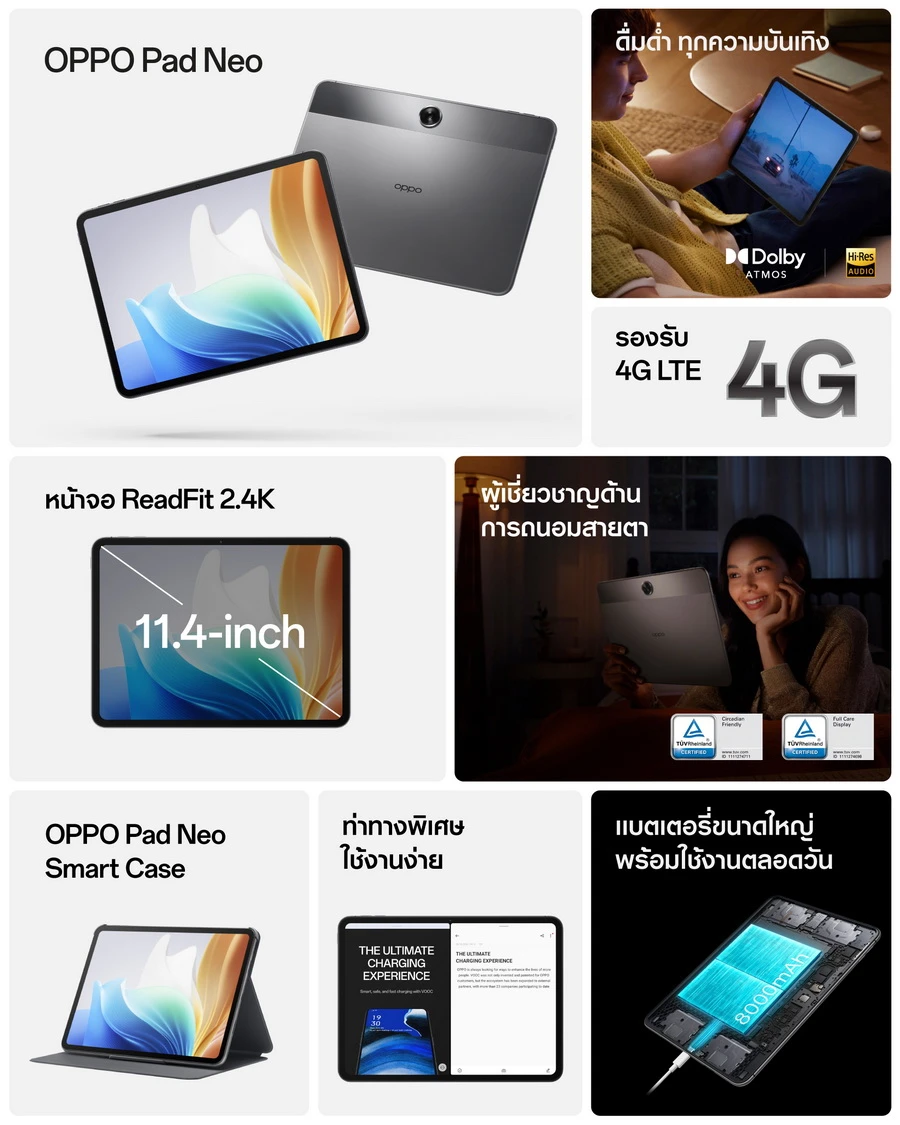 OPPO Pad Neo แท็บเล็ตทรงพลัง จัดเต็มทุกอรรถรสภาพและเสียงด้วยหน้าจอใหญ่และระบบลำโพงคุณภาพสูง มาพร้อมหน้าจอแสดงผลถนอมสายตา 2.4K ขนาดใหญ่ถึง 11.4 นิ้วตัวแรกในอุตสาหกรรมให้ความละเอียดสูง ในขณะที่ปล่อยแสงสีฟ้าต่ำทำให้สามารถอ่านหรือรับชมเนื้อหาได้อย่างสบายตา แสดงผลภาพในอัตราส่วนภาพ 7:5 ขนาดคล้ายกับหน้าจอ PC, กระดาษ A4 หรือหนังสือ ทำให้สามารถใช้งานได้อย่างคุ้นเคย โดยไม่ต้องปรับขนาดเนื้อหาด้วยตนเองอีกต่อไป เมื่อดูในด้านดีไซน์ OPPO Pad Neo ให้ความรู้สึกเรียบหรูด้วยสีเทา (Space Grey) ตัวเครื่องเพรียวบาง โดยมีความบางเพียง 6.89 มม. และน้ำหนักเบาเพียง 538 กรัม ทำให้สามารถพกพาสะดวกตลอดวัน ไม่ว่าจะเล่นเกมหรือดูหนังบน OPPO Pad Neo ก็เต็มอรรถรสจุใจด้วยลำโพงสเตอริโอ 4 ตัวมาพร้อมระบบเสียง Dolby Atmos® มอบประสบการณ์เสียงหลายมิติสมจริงรอบด้านและรองรับเสียง Hi-Res จอยไปกับความบันเทิงตลอดวันอย่างไร้กังวลด้วยแบตเตอรี่ขนาดใหญ่ 8,000mAh รองรับการชาร์จไว 33W SUPERVOOC