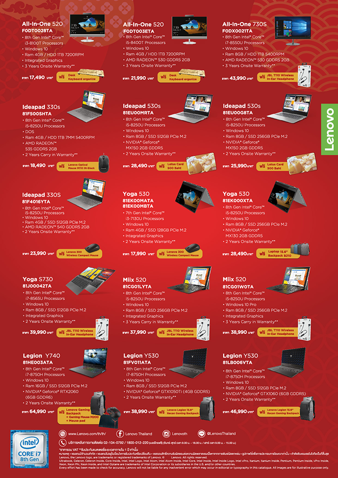 เลอโนโว ผู้นำยอดขายคอมพิวเตอร์อันดับ 1 จัดแคมเปญ "Happy Chinese New Year 2019" นำสินค้าสินค้ากลุ่มคอนซูเมอร์ ทั้ง Lenovo All-In-One, Lenovo IdeaPad, Lenovo Yoga, Lenovo Miix และ Lenovo Legion มาเอาใจคอคอมพิวเตอร์ตั้งโต๊ะและโน๊ตบุ๊ค พร้อมคืนกำไรให้ลูกค้าทุกท่าน ด้วยการมอบของสมนาคุณมากมายอย่าง ออร์กาไนเซอร์สำหรับจัดเก็บสิ่งของบนโต๊ะเดสก์ท็อป, หูฟังไร้สาย JBL แบบ In-Ear, Lenovo ออฟติคอลเม้าส์, บัตรของขวัญจาก Lotus, เมาส์ไร้สาย Lenovo และกระเป๋าเป้ขนาด 15.6 นิ้ว เมื่อลูกค้าซื้อผลิตภัณฑ์โน๊ตบุ๊คและคอมพิวเตอร์ของเลอโนโวที่ร่วมรายการ ตั้งแต่วันนี้ ถึง 31 มีนาคม 2562