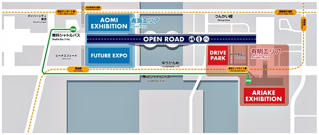 Open Road มีความยาว 1.5 กม. เชื่อมโยงระหว่างพื้นที่จัดงานโตเกียวมอเตอร์โชว์ในอาริอาเกะและอาโอมิเข้าด้วยกัน โดยมีต้นแบบยานยนต์ขนาดเล็กและยานยนต์ส่วนบุคคลคอยพาผู้ชมงานเดินทางมาไปตลอดถนนเส้นนี้ ด้วยรูปแบบอันหลากหลายของยานยนต์ทั้งที่ขับบนถนน ในทะเล หรือบนอากาศ